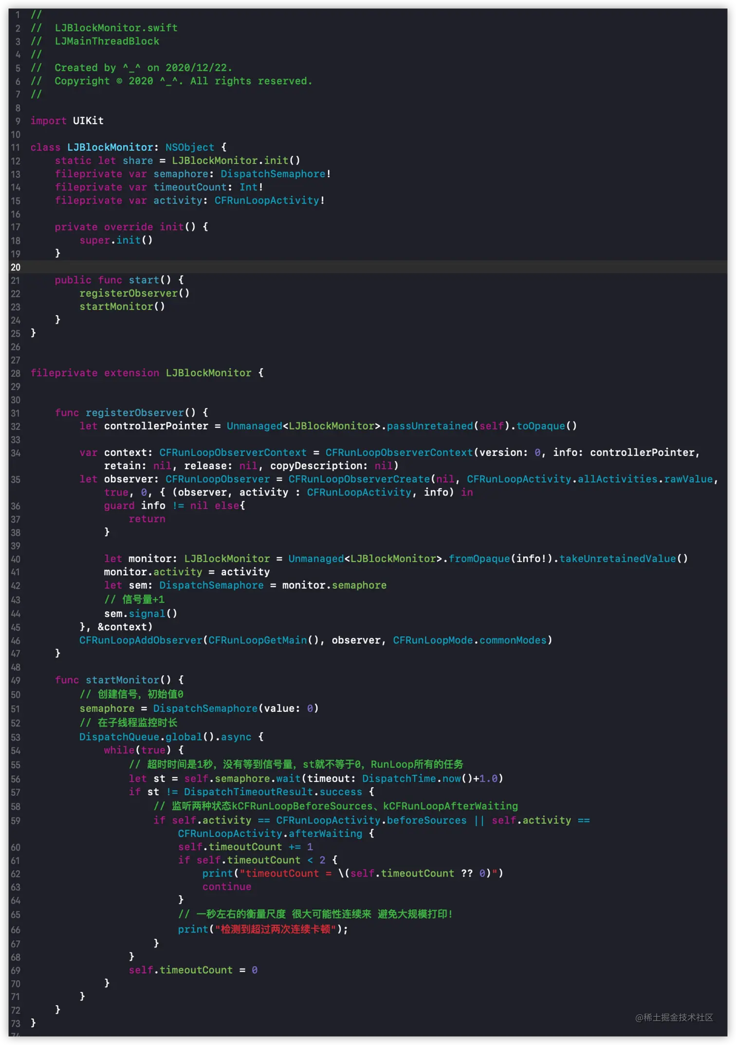 主线程卡顿监控:通过子线程监测主线程的RunLoop,判断两个状态(kCFRunLoopBeforeSources和kCFRunLoopAfterWaiting)之间的耗时是否达到一定阈值