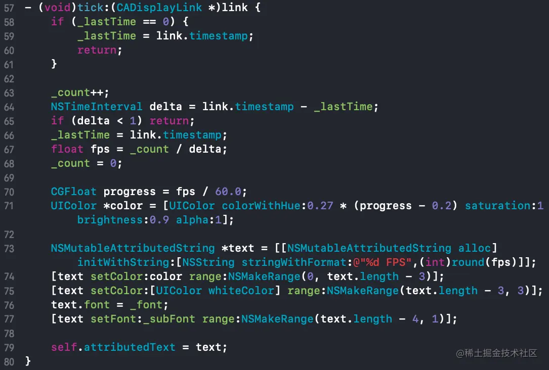FPS的监控,参照YYKit中的YYFPSLabel,主要是通过CADisplayLink实现。借助link的时间差,来计算一次刷新刷新所需的时间,然后通过刷新次数/时间差得到刷新频次,并判断是否其范围,通过显示不同的文字颜色来表示卡顿严重程度。核心代码实现如下:
