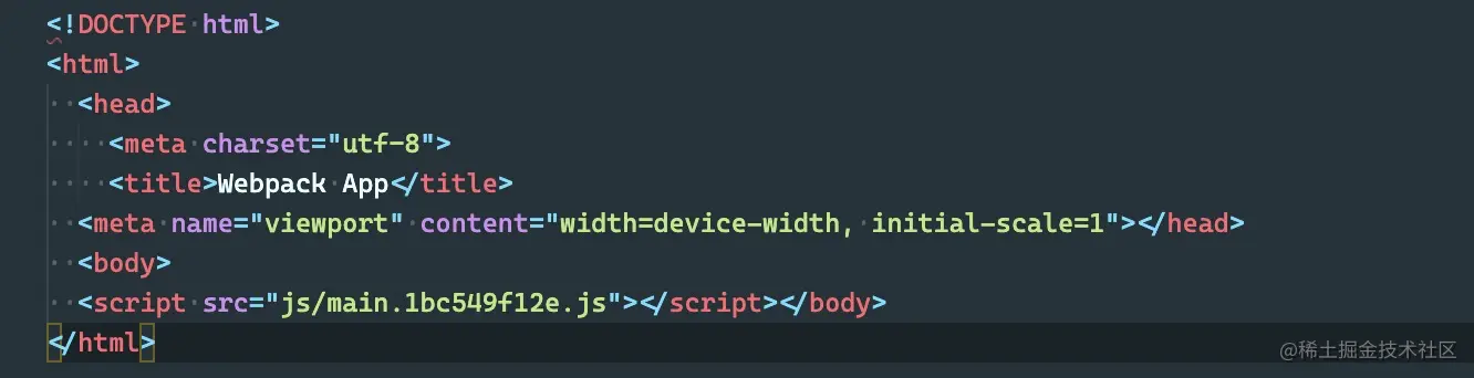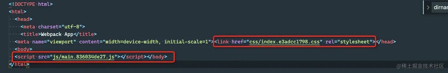 打开生成的 index.html 文件,我们可以看到打包出来的js文件被自动引入了: