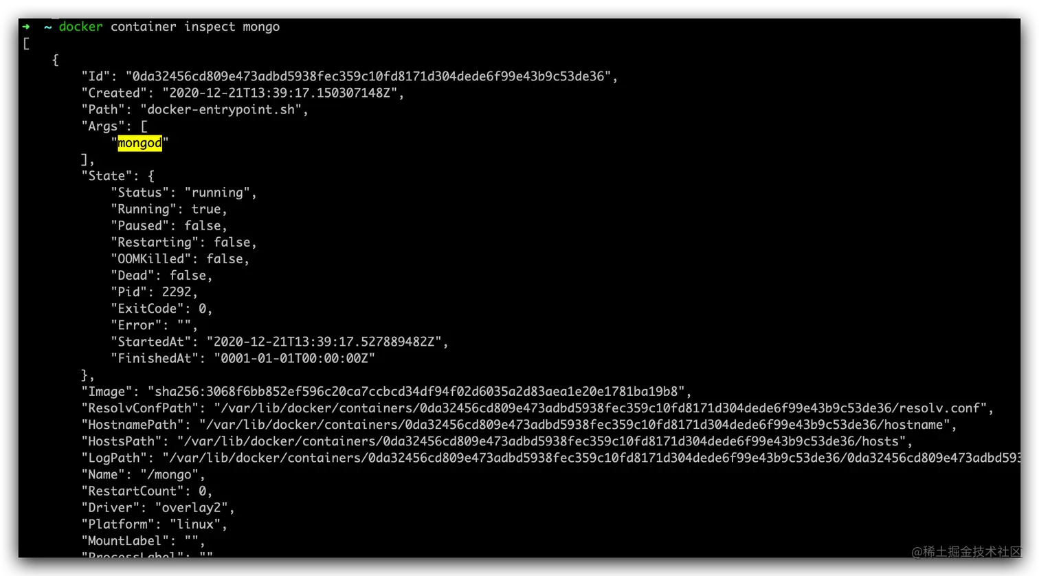 docker container inspect mongo查看Container 的详细信息(JSON 的数据形式)