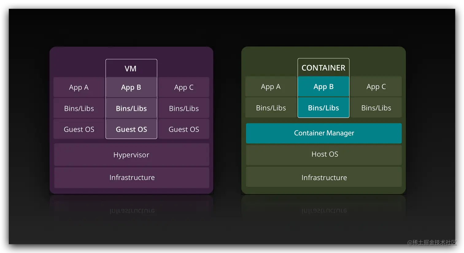 大家对 Docker 都应该有了或多或少的认识了,相信大家都是从这两张图来粗旷的理解 Docker 及容器概念的
