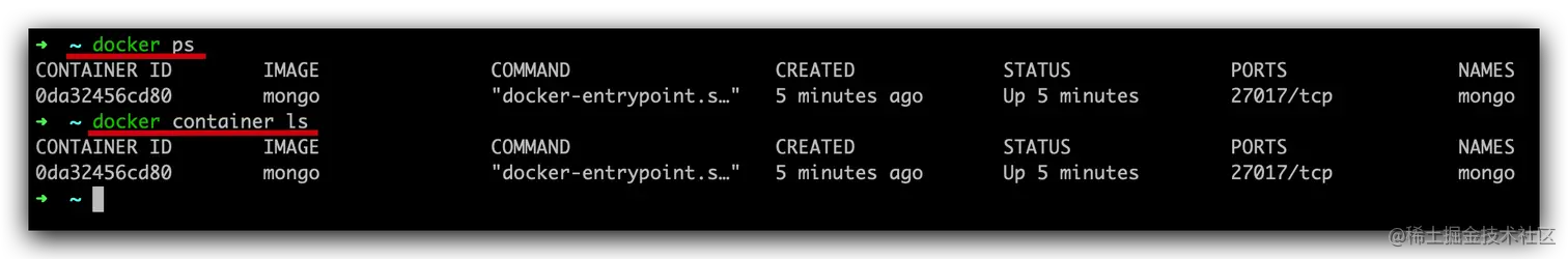 然后我们通过下面命令列举出正在运行的容器 (以下两个命令等同)