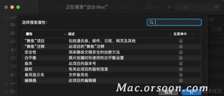 另外,当点击上图中的“名称”,然后选择“其它”,它会列出所有可能的 macOS 支持的可搜索的属性: