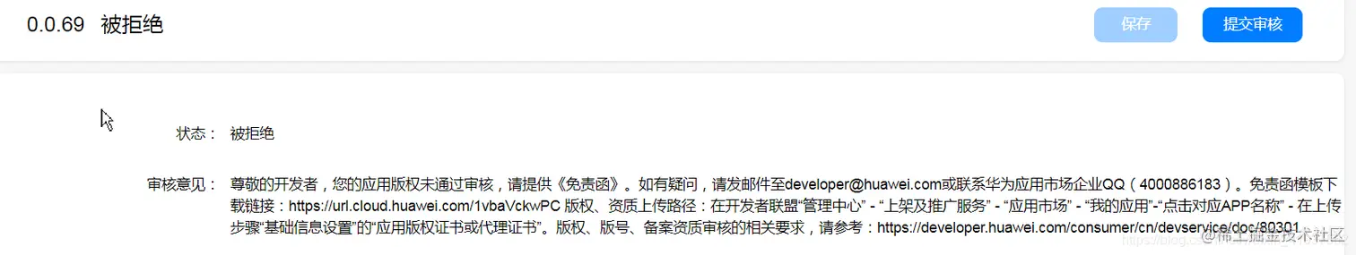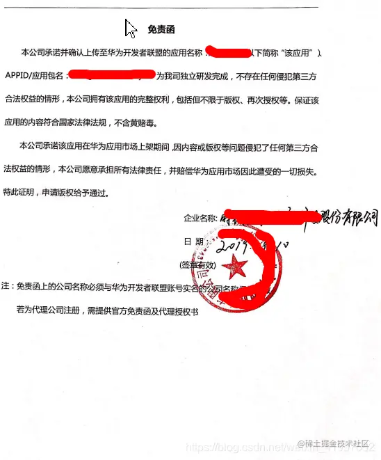 上架华为应用市场缺少免责函? 孙叫兽 2020-12-24 838 阅读1分钟 针对华为应用市场,不管提交的是什么类型的应用,都应该提交免责函, 需要提前下载模板进行盖章后,转成图片上传。 免责函模板如下: 被拒绝的信息如下: 再次将免责函提交上去就没啥问题啦,因为其他应用市场都已经上架成功,不同的应用商店有一定的特色。阿里应用商店还需要提供安全报告才行。 再次点击顶部的提交审核即可。
