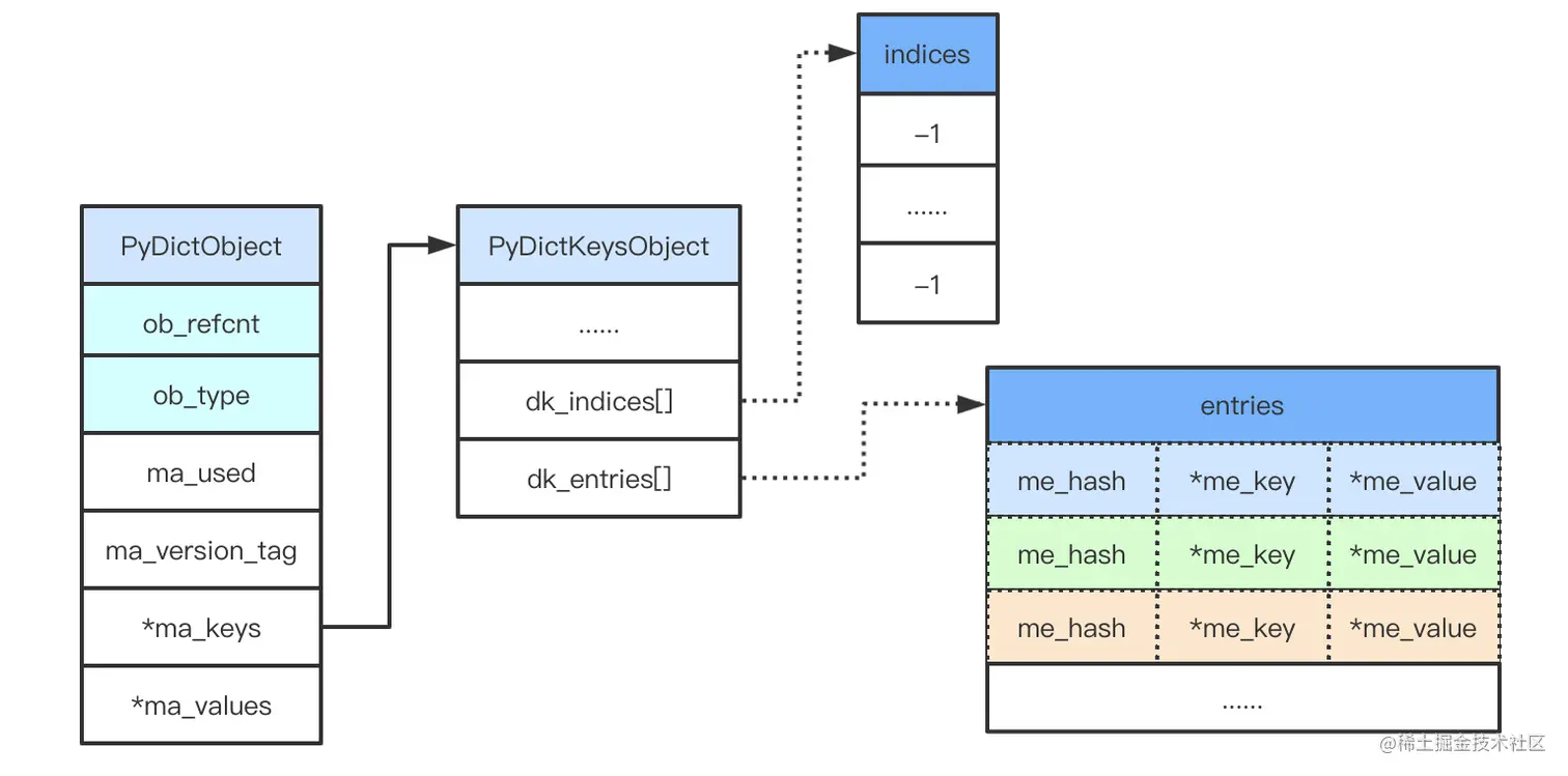 这里Python为了节省内存,将索引和哈希表数组分开,分为dk_indices和dk_entries。前者保存的是数据的索引,占空间小,可申请所有元素个数的空间。后者可以只申请原大小的2/3空间。因为到2/3之后,便会扩容,这个2/3可以根据dk_indices获得。