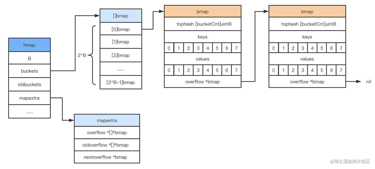 最外层为一个hmap的结构体,使用一个[]bmap数组存放了bmap的地址,bmap用来存储数据,每个bmap最多可存储8个kv对,另外还有一个overflow,存储后一个bmap的地址。 oldbuckets 用来存放老的buckets数组地址,在扩容的时候会使用来暂存还没有移到新buckets数组的bmap地址。mapextra 用来存放非指针数据,用于优化存储和访问。