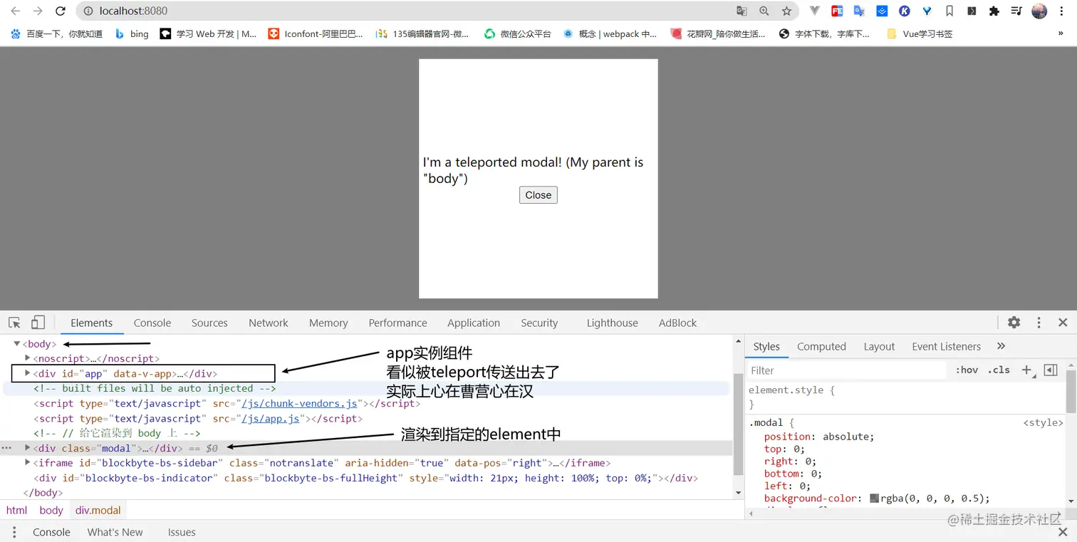 <teleport to="body"> </teleport>后的效果图如下,我们实现了基于body的居中弹窗: - 我们需要注意使用