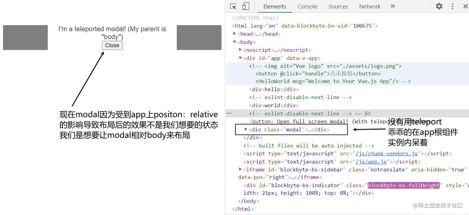 在vue2下),并使用vue3的传送门来解决这个业务场景,官方的演示地址 - 在vue2中因为只允许有一个根节点,代码书写如下:(