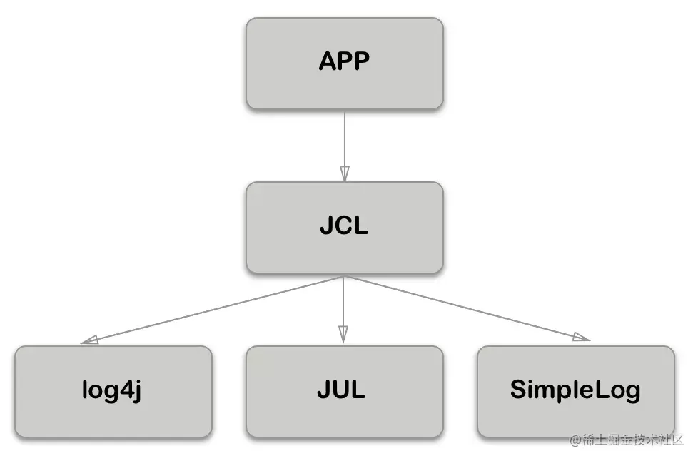 4.Apache见此,开发了JCL(Jakarta Commons Logging),即commons-logging-xx.jar。它只提供一套通用的日志接口api,并不提供日志的实现。很好的设计原则嘛,依赖抽象而非实现。这样应用程序可以在运行时选择自己想要的日志实现组件。