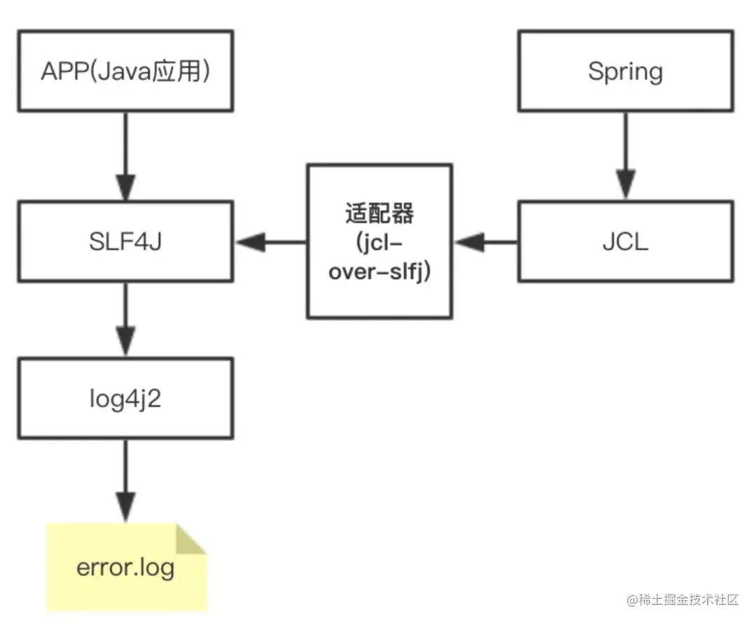 这就是为了对slf4j的适配做一个例子说明。Spring是用JCL作为日志门面的,那我们的应用是slf4j + logback,怎么让Spring也用到logback作为日志输出呢?这样的好处就是我们可以统一项目内的其他模块、框架的日志输出(日志格式,日志文件,存放路径等,以及其他slf4j支持的功能) 很简单,就是加入jcl-over-slf4j.jar就好了。我又盗了一个图来说明