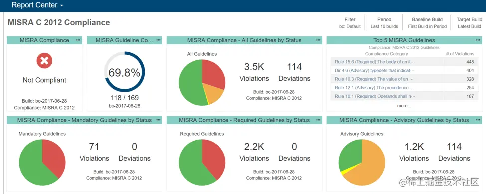 - 基于严重性的优先级。开发人员会修复分配给他们的模块的所有强制性发现。随着时间的推移,他们会根据团队负责人选择的优先级,在时间允许的情况下解决所有要求的违规行为。 对于上述任何一种方法,对于技术负责人和管理人员而言,通过集中式仪表板不断监视进度和项目合规性状态至关重要。例如,Parasoft的报告中心提供了以下预配置的合规性状态仪表板: