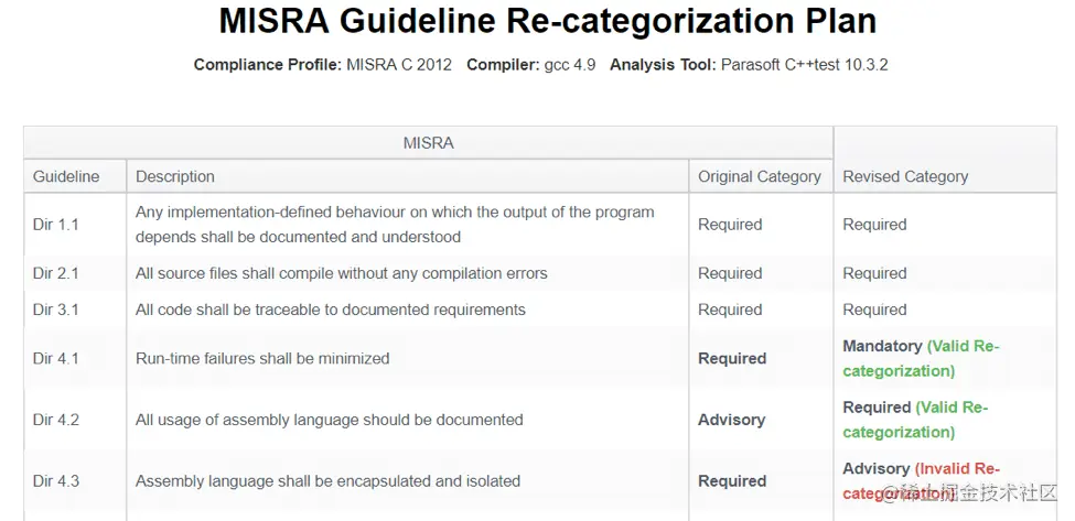 - 准则合规摘要——是总体项目合规性的主要记录。 为了专注于处理遗留代码库,关键文档是指南重新分类计划。本文档包含所有指令和规则,并确定已重新分类了哪些类别。例如,下图显示了重新分类计划的一部分: