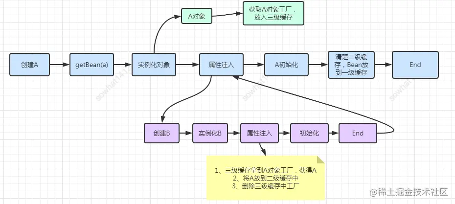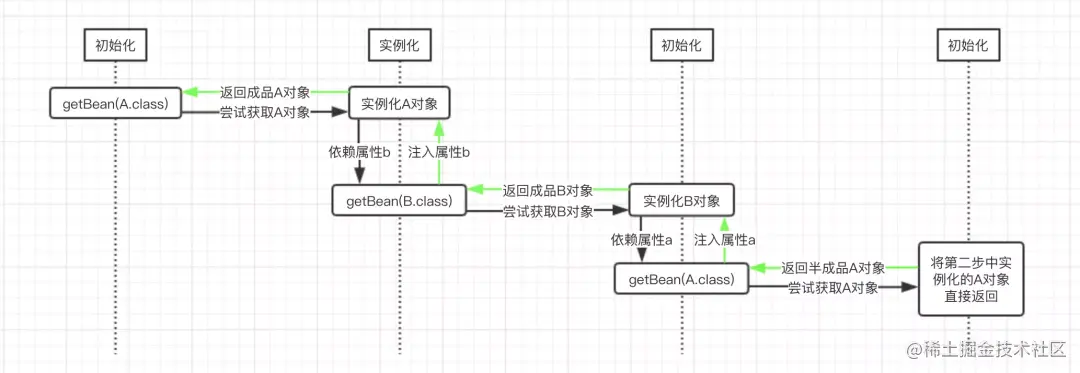 图中getBean()表示调用Spring的ApplicationContext.getBean()方法,而该方法中的参数,则表示我们要尝试获取的目标对象。图中的黑色箭头表示一开始的方法调用走向,走到最后,返回了Spring中缓存的A对象之后,表示递归调用返回了,此时使用绿色箭头表示。从图中我们可以很清楚的看到,B对象的a属性是在第三步中注入的半成品A对象,而A对象的b属性是在第二步中注入的成品B对象,此时半成品的A对象也就变成了成品的A对象,因为其属性已经设置完成了。到这里,Spring整个解决循环依赖问题的实现思路已经比较清楚了。对于整体过程只要理解两点: