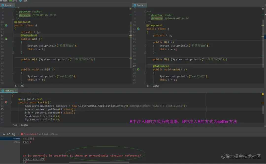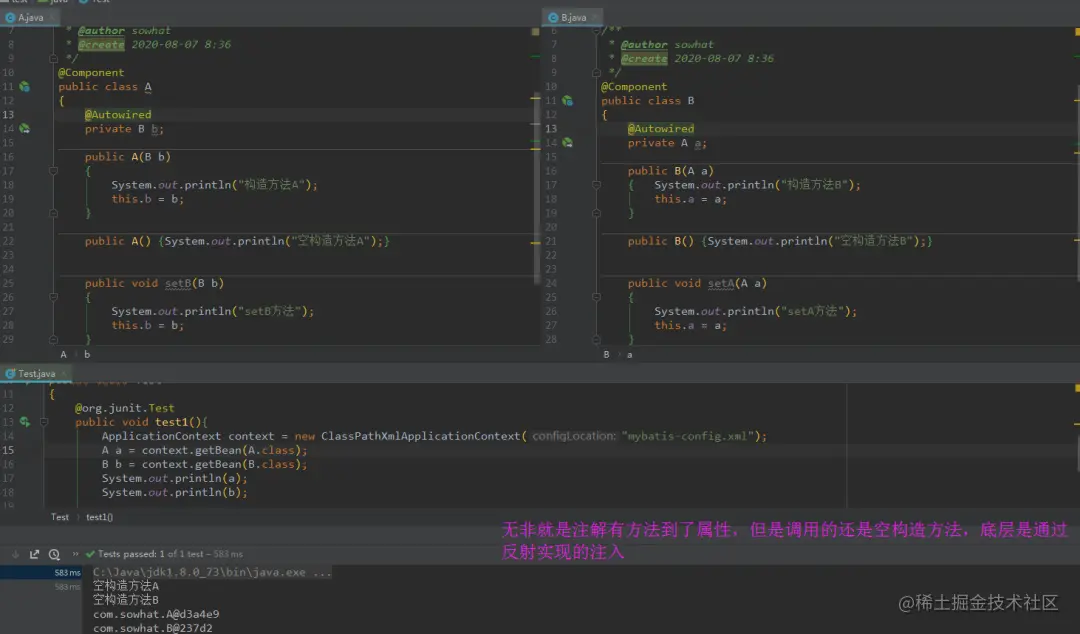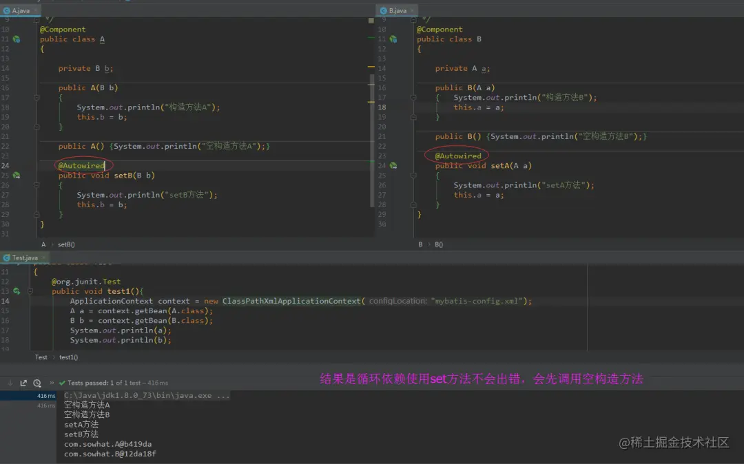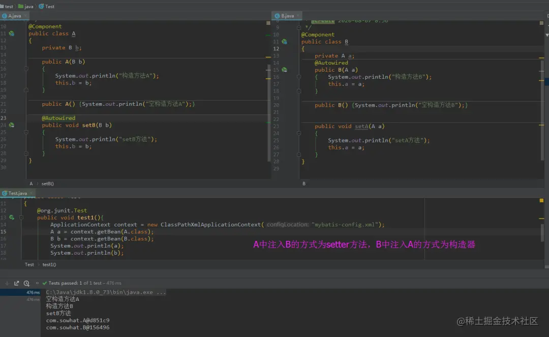 A中注入B的方式为setter方法,B中注入A的方式为构造器