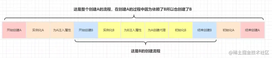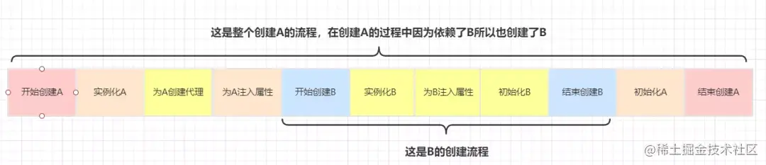 B中注入A的方式为setter方法,A中注入B的方式为构造器,Spring在创建Bean时默认会根据自然排序进行创建,A会先于B进行创建
