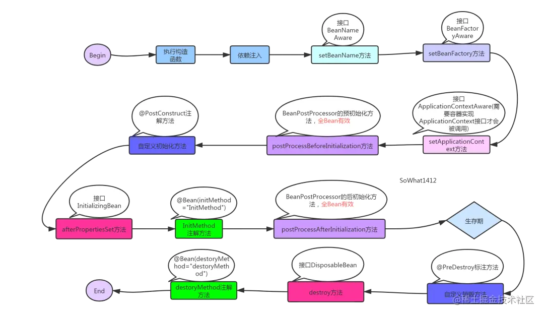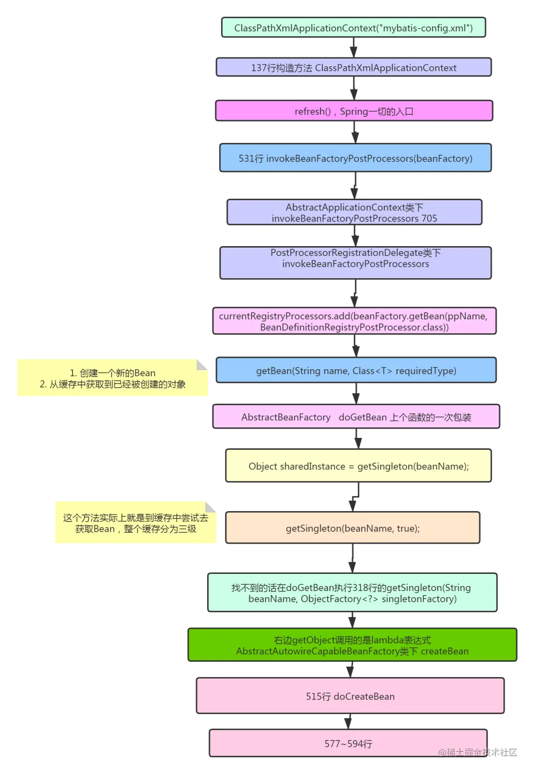 是否可以用二级缓存而不用三级缓存?答案:不可以,违背Spring在结合AOP跟Bean的生命周期的设计!Spring结合AOP跟Bean的生命周期(看下图)本身就是通过AnnotationAwareAspectJAutoProxyCreator这个后置处理器来完成的,在这个后置处理的postProcessAfterInitialization方法中对初始化后的Bean完成AOP代理。如果出现了循环依赖,那没有办法,只有给Bean先创建代理,但是没有出现循环依赖的情况下,设计之初就是让Bean在生命周期的**「最后一步完成代理而不是在实例化后就立马完成代理」**。❞