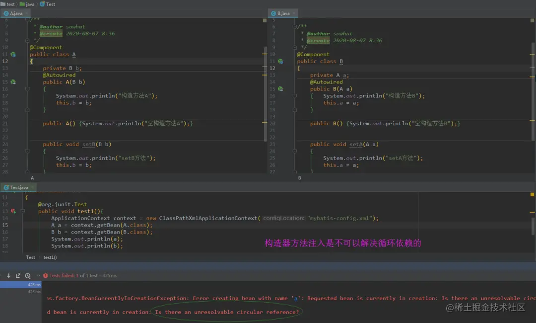 从上面的测试结果我们可以看到,不是只有在setter方法注入的情况下循环依赖才能被解决,即使存在构造器注入的场景下,循环依赖依然被可以被正常处理掉。