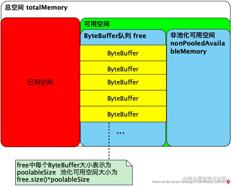 声明1 可用空间 = 池化空间+非池化空间 (nonPooledAvailableMemory + free.size()*poolableSize)