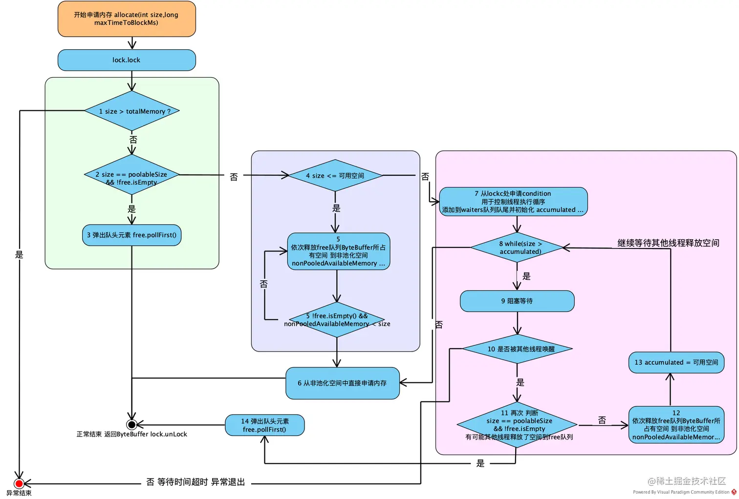 /14 /走到这里的逻辑 可用空间小于消息长度 并且有线程申请的时候刚好申请的是poolableSize大小的内存 释放直接释放到free队列 所以这里再进一步检查