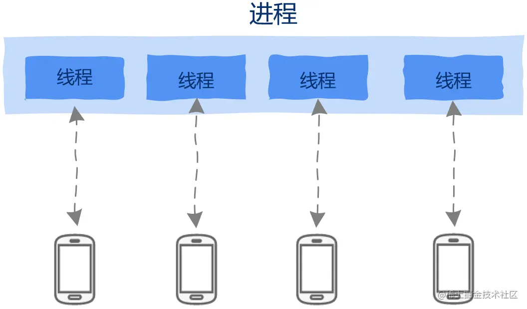 我们可以为每个请求创建一个线程,即使一个线程因执行I/O操作——比如读取数据库等——被阻塞暂停运行也不会影响到其它线程,就像这样: