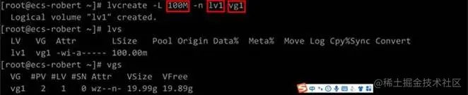 (5)通过lvcreate -L 100M -n lv1 vg1命令创建逻辑卷