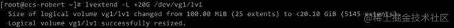 (2)扩充逻辑卷:lvextend –L +20G /dev/vg1/lv1