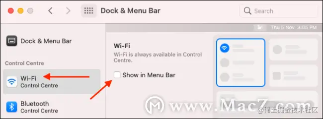 在这里,您会看到侧栏中列出的所有控件。选择一个控件(例如“ Wi-Fi”),然后选中“在菜单栏中显示”选项,以将该控件添加到菜单栏中。取消选中从菜单栏中删除控件的选项。
