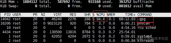 如下图所示,CPU使用率突增,且存在两个异常进程:.gpg 和pnscan ,其中“.gpg ”CPU占用率高达94%:
