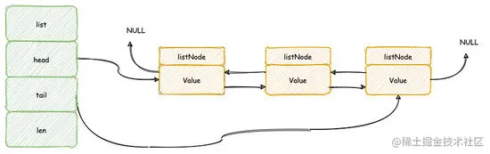 list 结构体中保存了表头节点,表尾节点以及链表包含的节点的数量,正因为如此操作表头/表尾元素的插入/弹出,链表长度的计算将会非常高效,时间复杂度为 O(1) 。