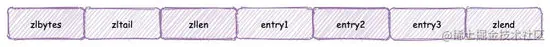 压缩列表是 Redis 为了节约内存而开发,它由一系列的特殊编码的的 连续内存块 组成的顺序型数据结构,整体结构如下: