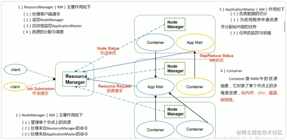 - container:这个鬼是yarn中的资源抽象,它封装了某个节点上的多维度资源,如内存,cpu,磁盘,网络......。