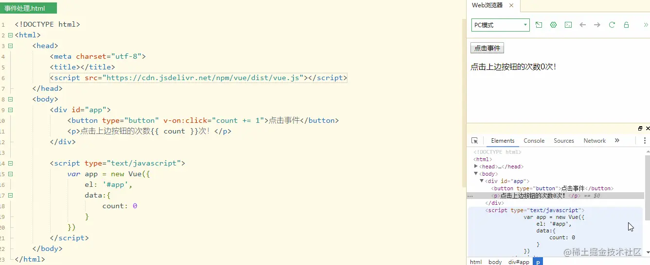this指向当前vue实例本身 - 事件还可以通过