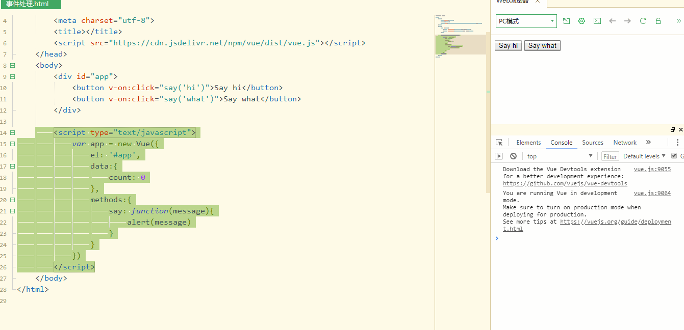 <button v-on:click="say('hi')">Say hi</button>
