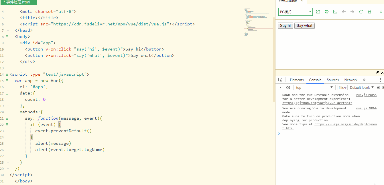 如果需要在内联处理器中访问原始DOM事件,可以将特殊变量$event参数传入方法!