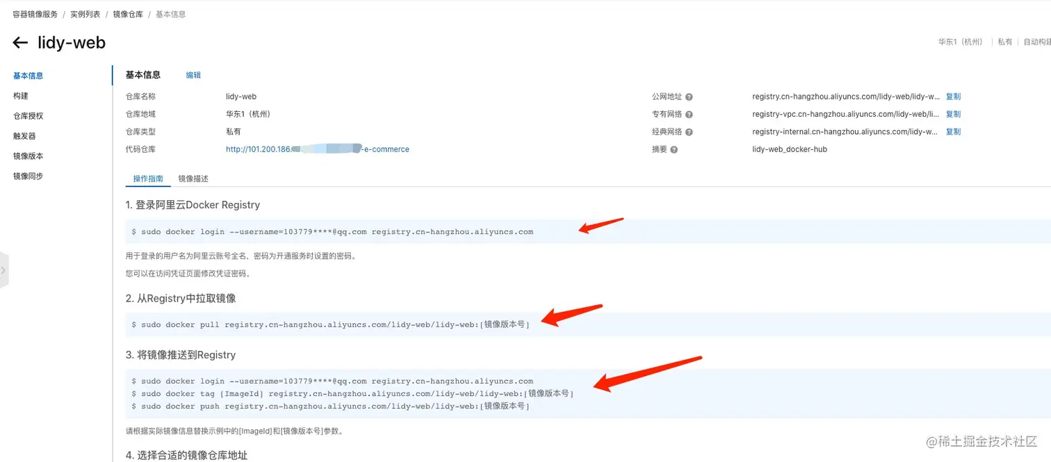 - 推送镜像之前,需要打 tag,tag 的前缀为当前镜像仓库的地址,此处为阿里云镜像仓库,具体配置如下:
