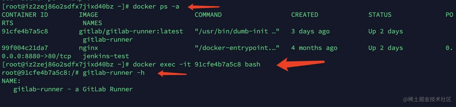 安装好 gitlab-runner之后,我们通过指令进入到 gitlab-runner 容器内部,使用 gitlab-runner -h是否正确安装