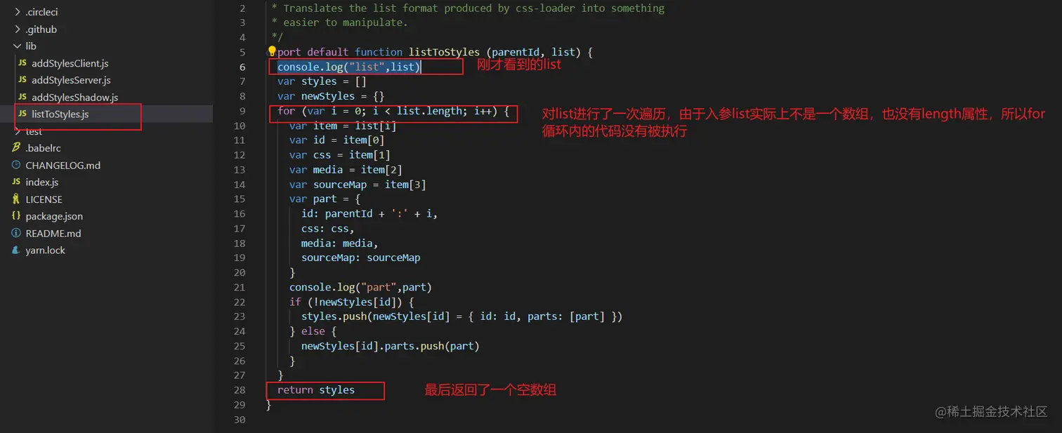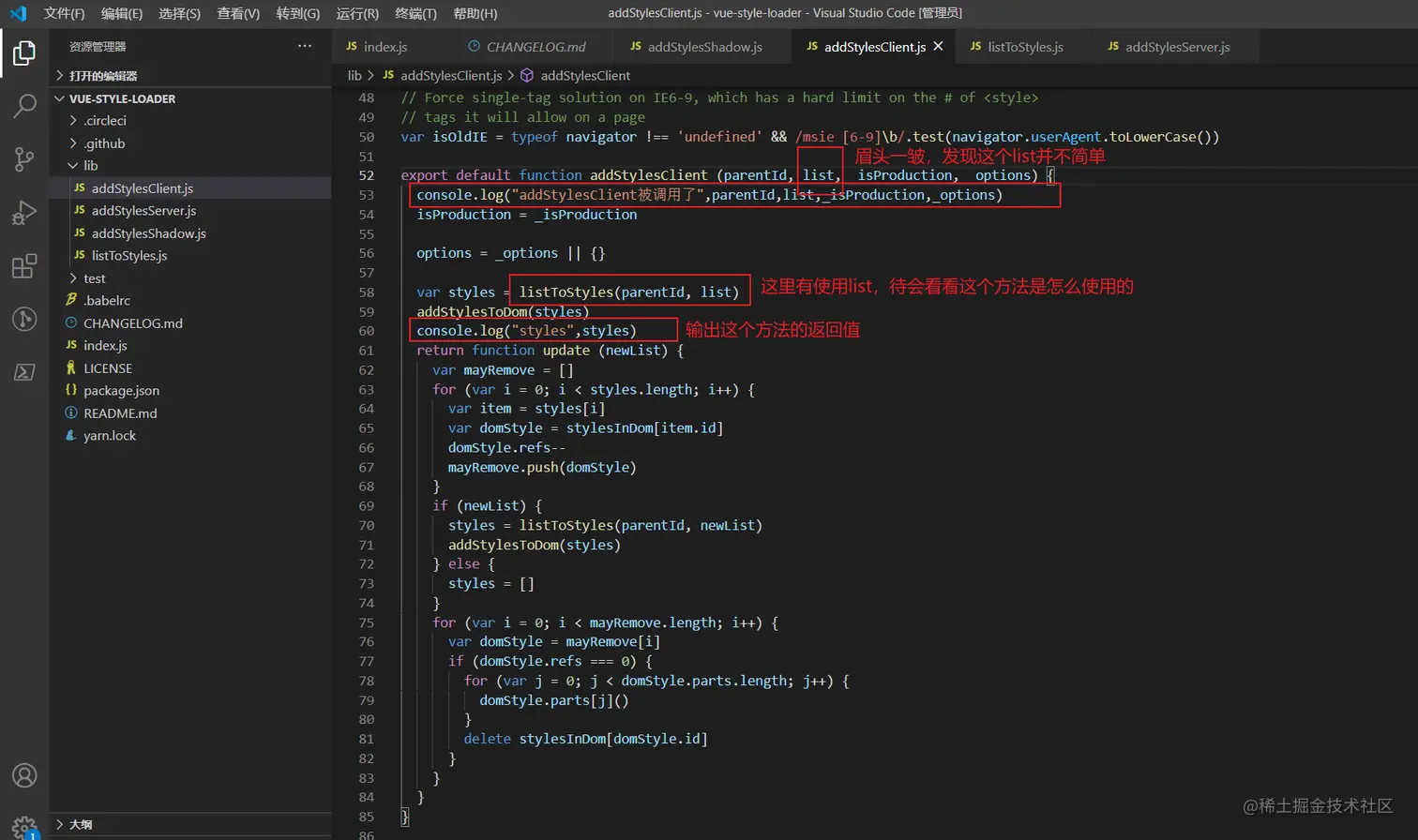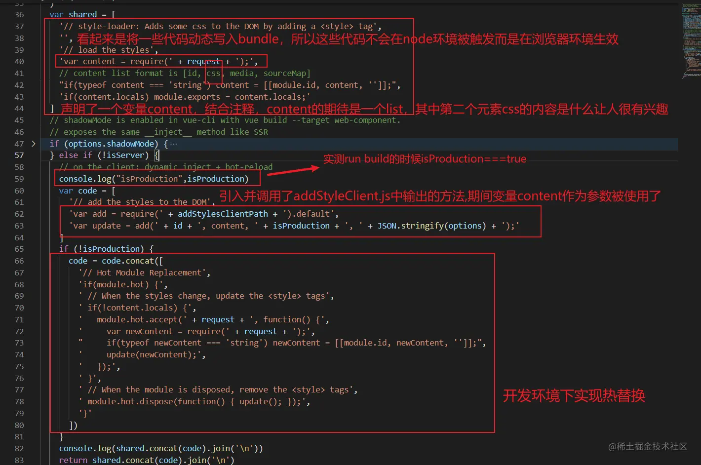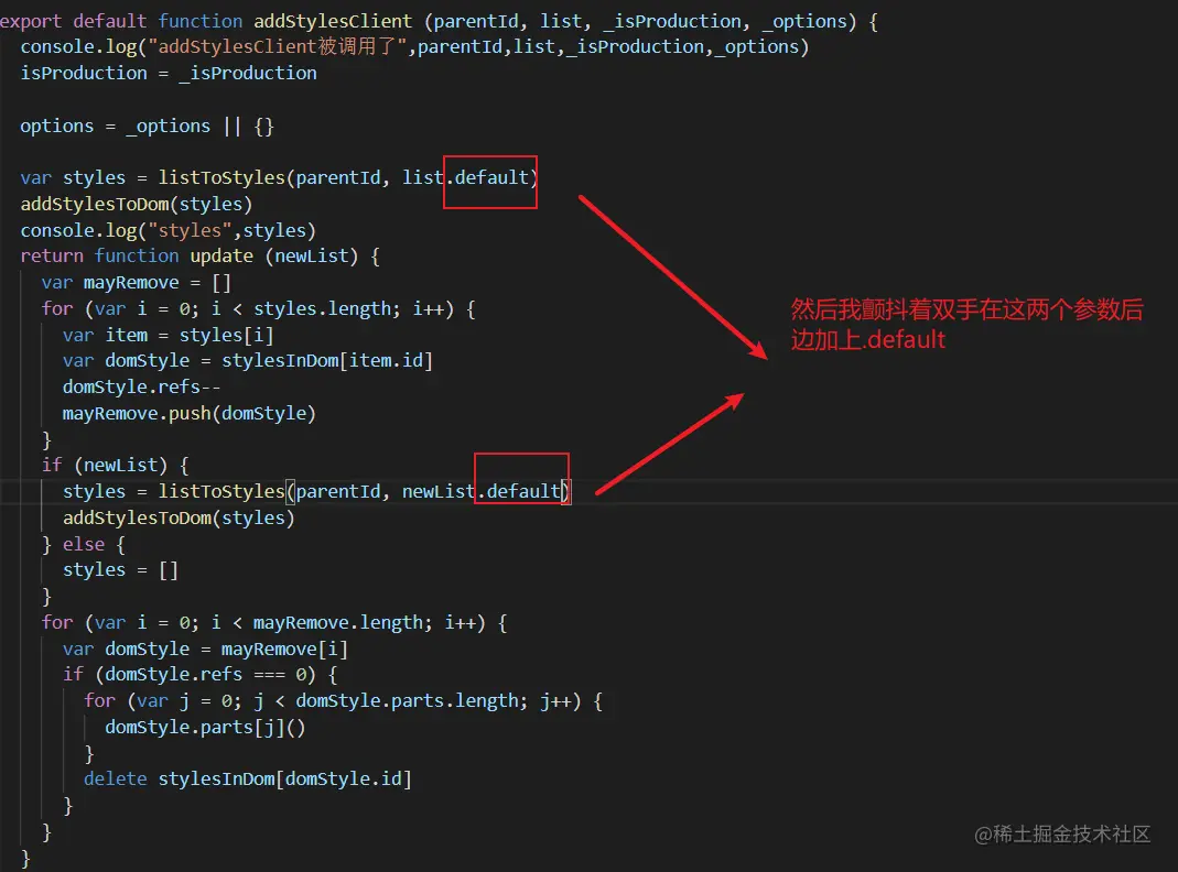 我之前大概了解到vue-style-loader是在style-loader的基础之上写出来的,主要功能跟style-loader类似,只是多了一些额外的特性,所以我想切换成style-loader试一下,然后愕然发现居然正常了,这就推测问题出在vue-style-loader身上,于是就在去看依赖的源码,做了一些尝试: