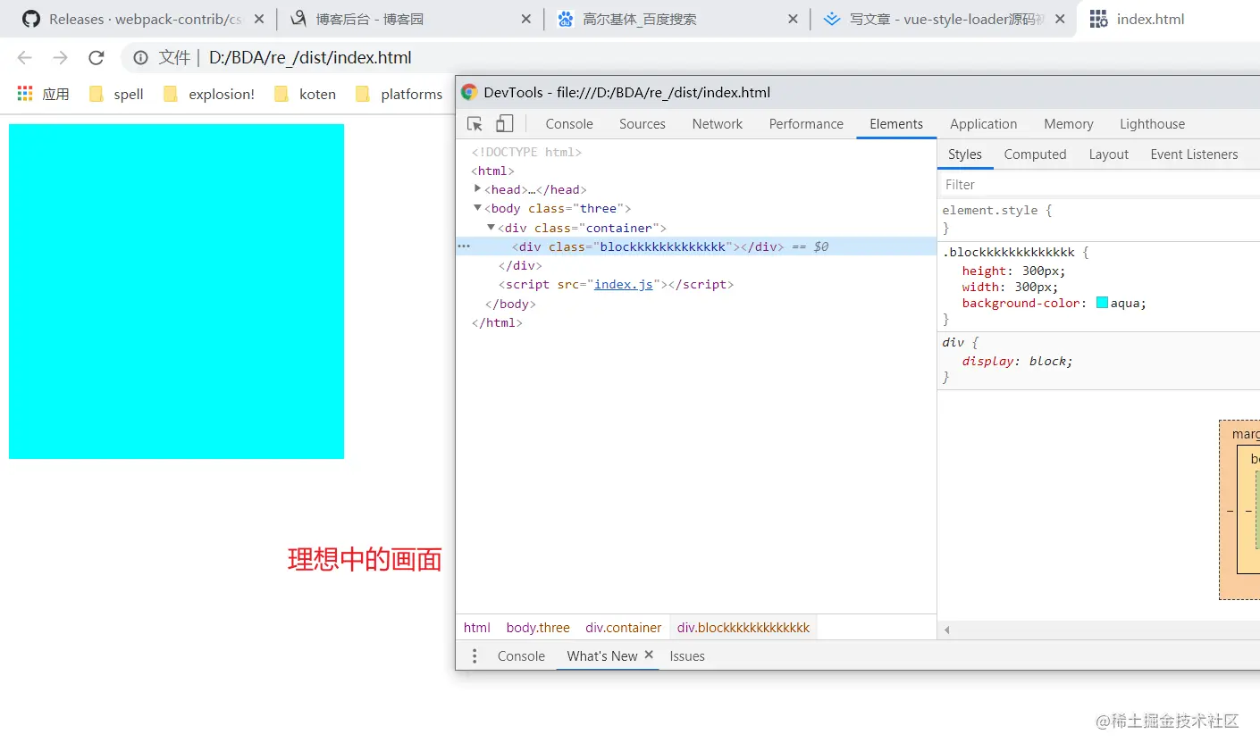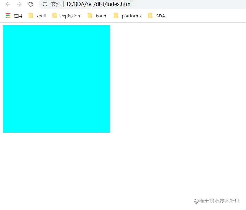 执行完打包命令之后,按理来说打开dist目录中的index.html页面中应该就会出现一个傻不愣登的正方形色块比如: