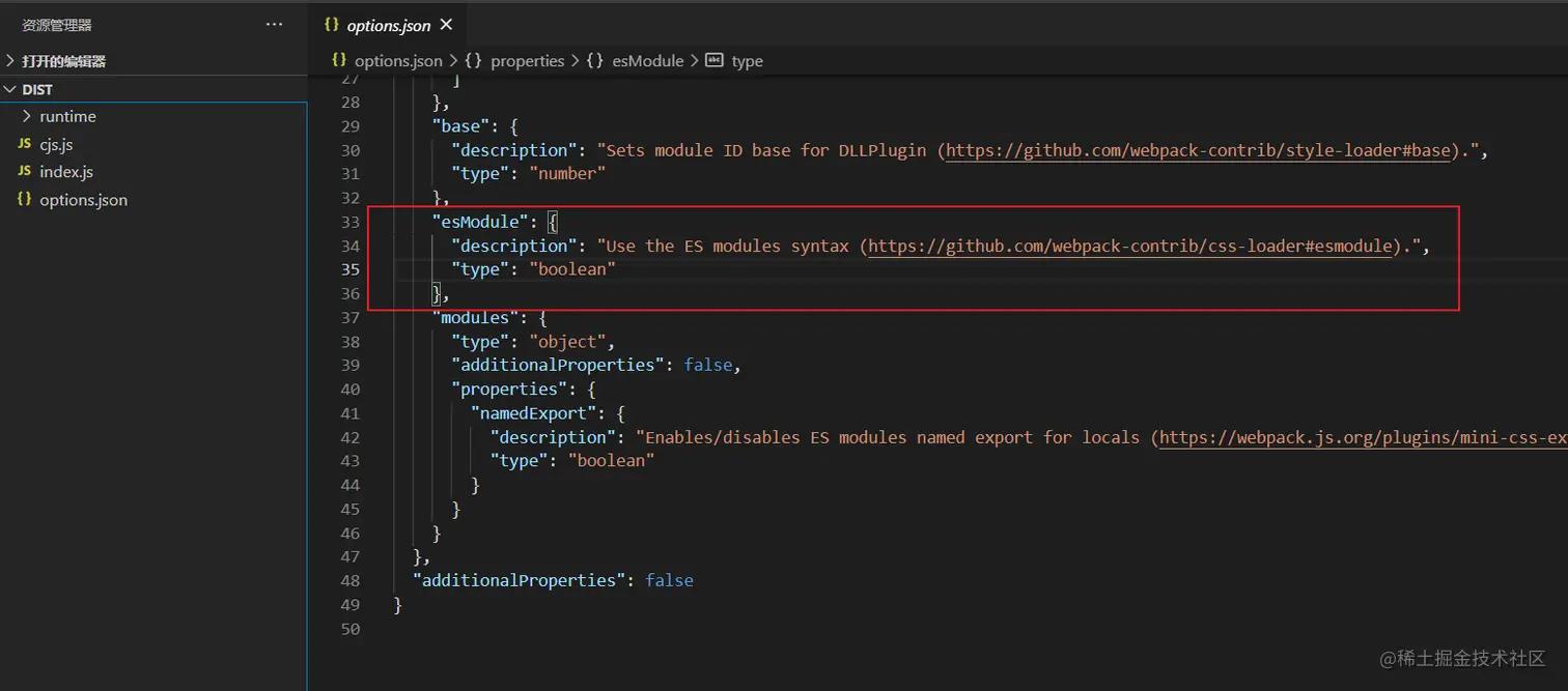 我开始思考vue-style-loader与style-loader的区别,为什么style-loader就能顺利处理esModule呢,然后我在style-loader的代码中找到了线索,源码中有个名为options的json文件,描述了这个loader的配置项及其含义,其中有一个esModule属性: