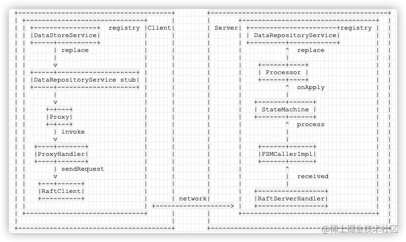 后端 Repository 可以看作 SOFAJRaft 的状态机,任何对 Map 的操作都会在集群内部,交由 Raft 协议进行同步,从而达到集群内部的一致。从代码中可以看到MetaRepositoryService加上了 RaftService 注解,这就是Raft的部分实现。