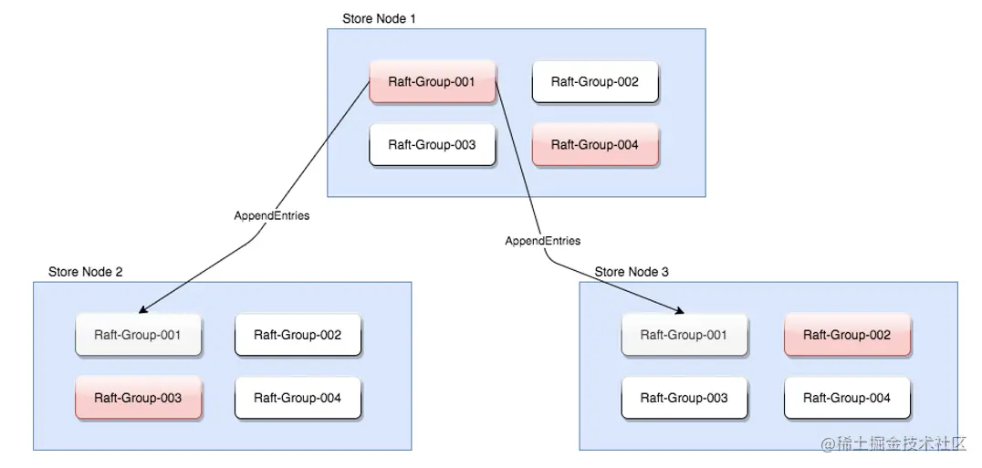 上图中,每个StoreNode节点是一个独立进程,内部有四组逻辑RaftGroup(橙色的节点为RaftGroup的Leader),各组RaftGroup之间是并行关系,可以做到Group间并行复制、并行commit。