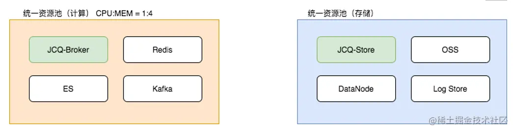 JCQ3.0后,计算节点Broker与存储节点Store独立部署,这两个组件可以各自选择适合自己业务的机型,部署在相应资源池中。这样 JCQ可以做到与其他产品混合部署,共用资源池水位,而不用独自承担资源水位线。
