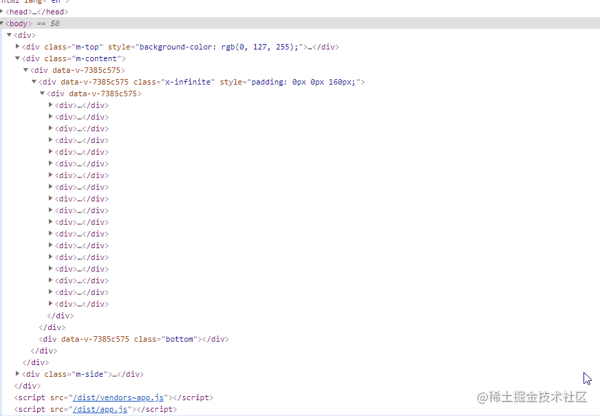但是这个时候会发现一个问题,就是随着列表的长度的增加,DOM节点也会增加(如下图),当DOM节点到达一定数量的时候,会发生卡顿,所以接下来就要对他进行优化了