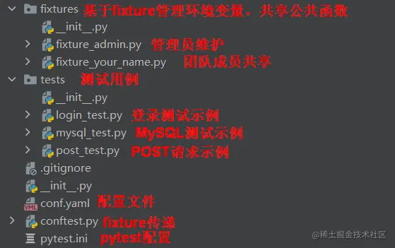 通过fixture技术,我们可以把重复代码提取出来,在团队间进行复用。tep重度使用了这个技术,在fixtures目录中,除了预置的fixture_admin.py,可以继续添加团队成员的fixture: