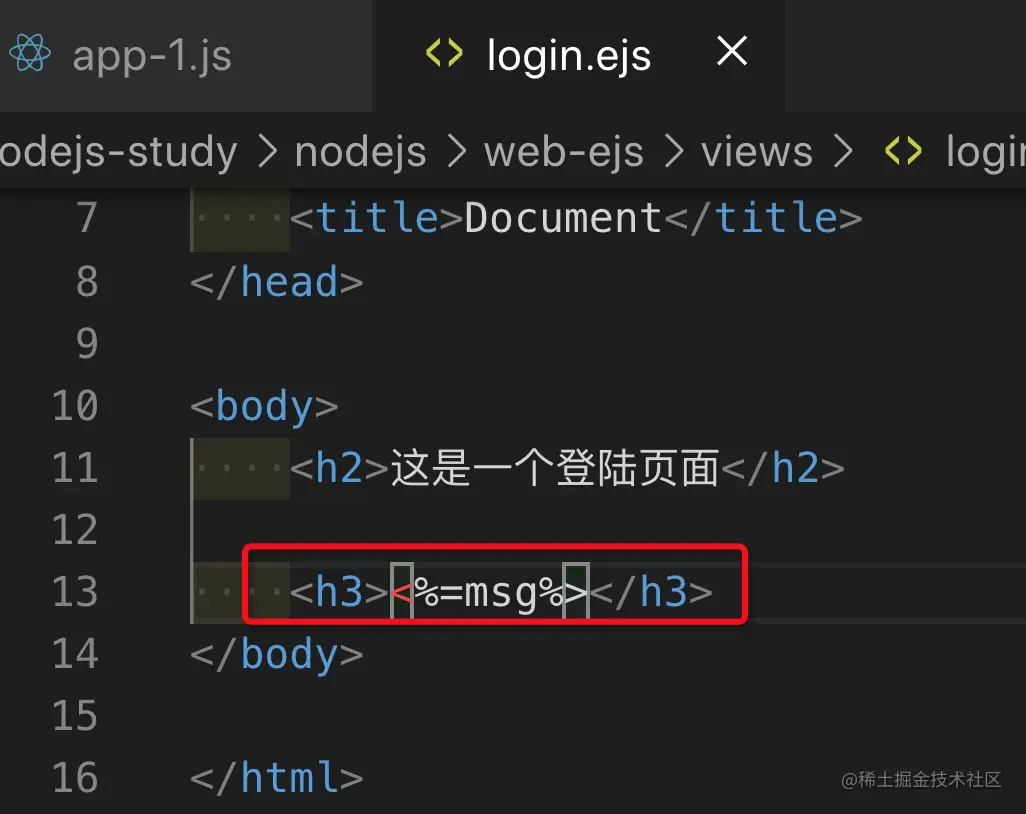 3)该文件夹下面 新建 views 写一个 文件 login.ejs 内容是 ejs 模版引擎