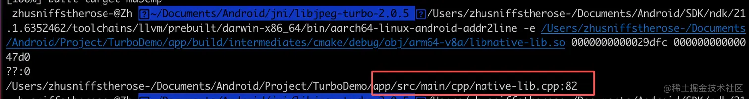 上图表明 native-lib.cpp 的 82 行出错.
