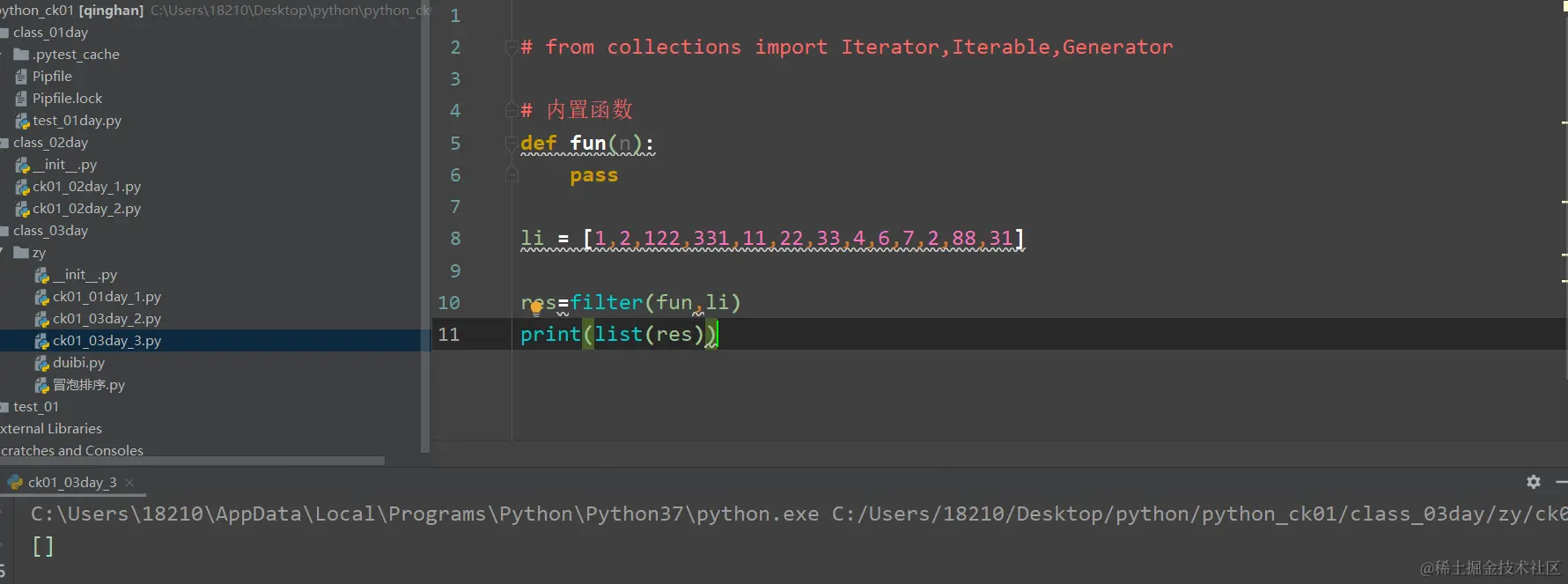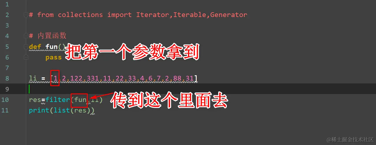 当我们把它转换成列表的时候,在这里传进去,它会返回一个对象,这个对象里有一个函数,还有个可迭代对象filter(fun,li)。