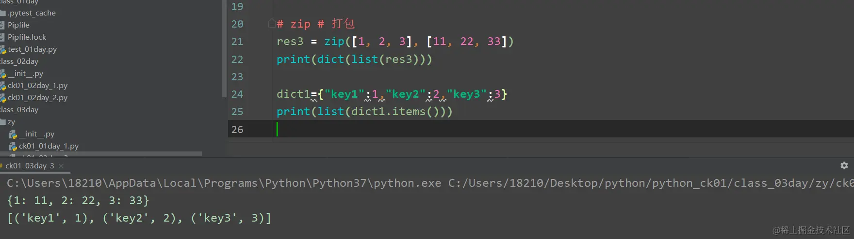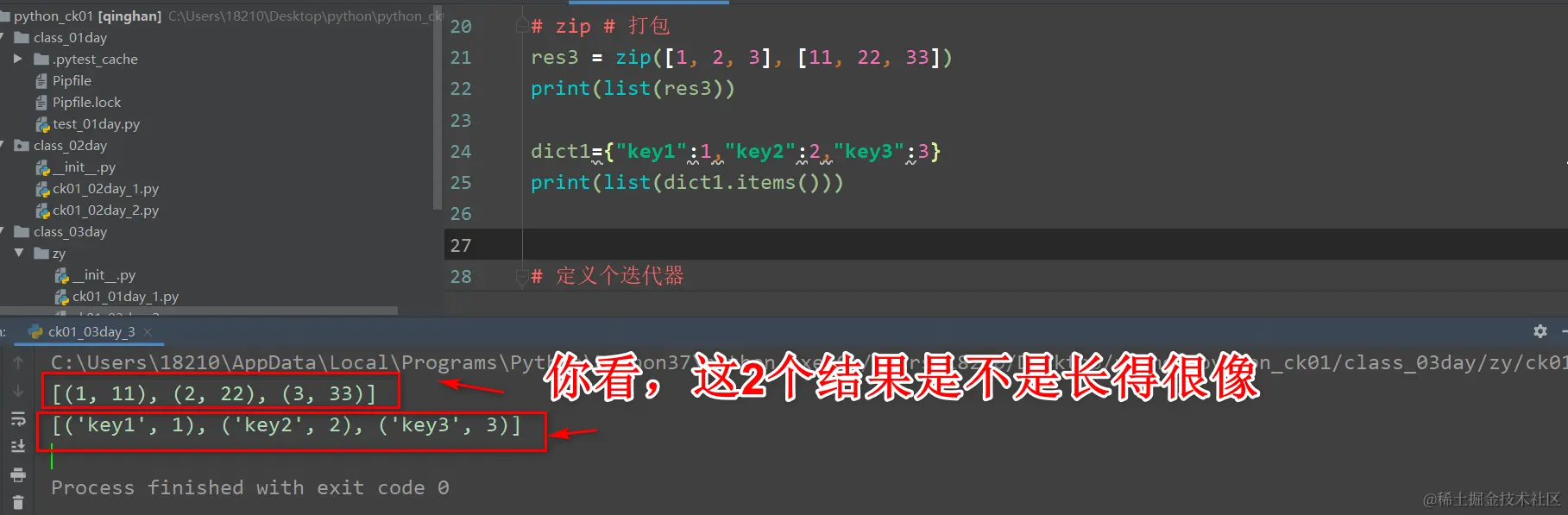 使用zip()函数传入 2 个可迭代对象,把第一个可迭代对象的第一个元素和第二个可迭代对象的第一个元素拿出来打包成一个元组,后面以此类推。