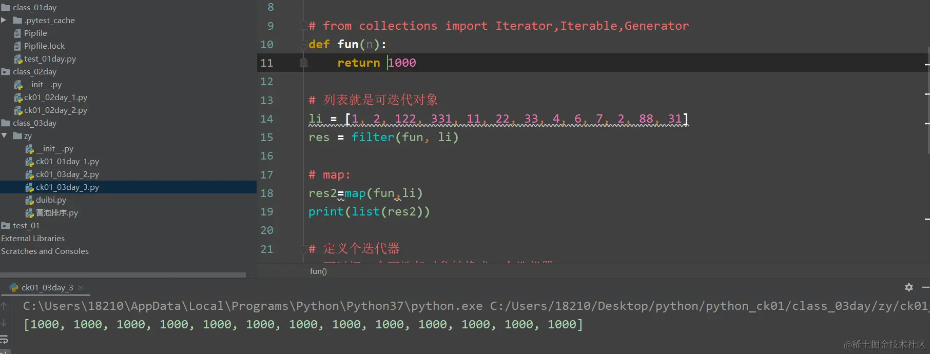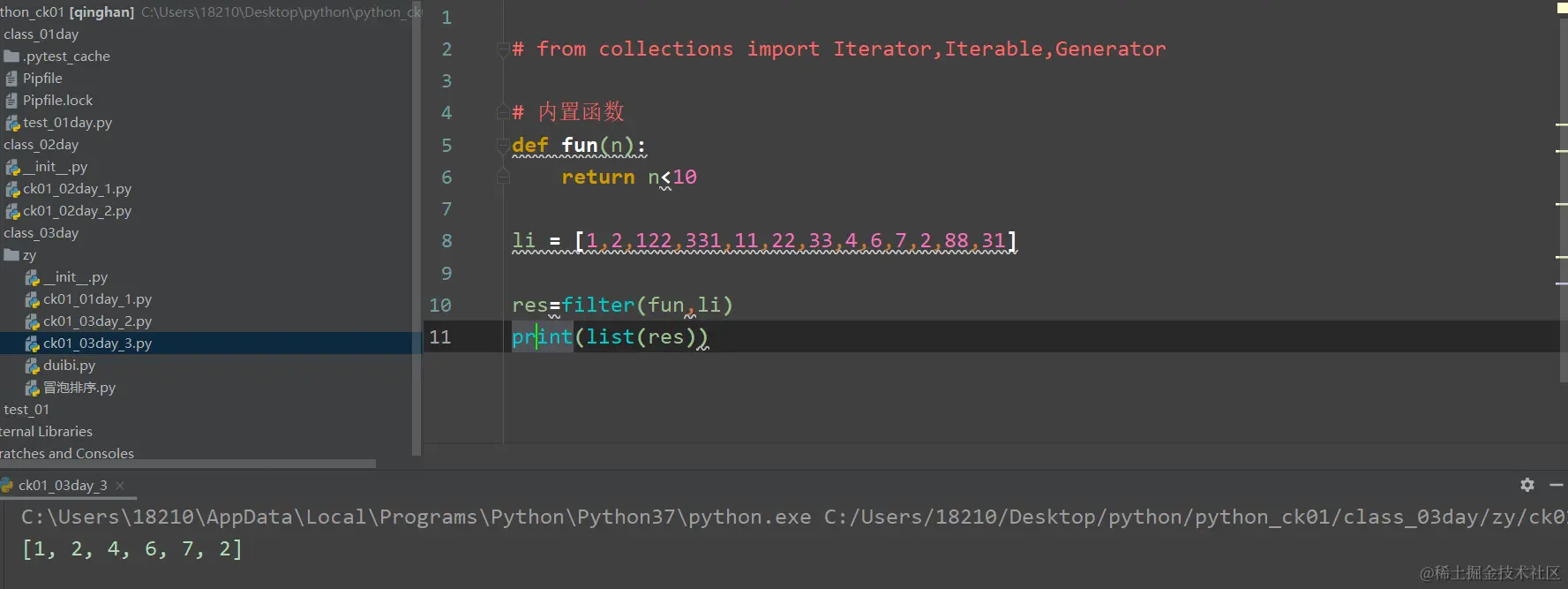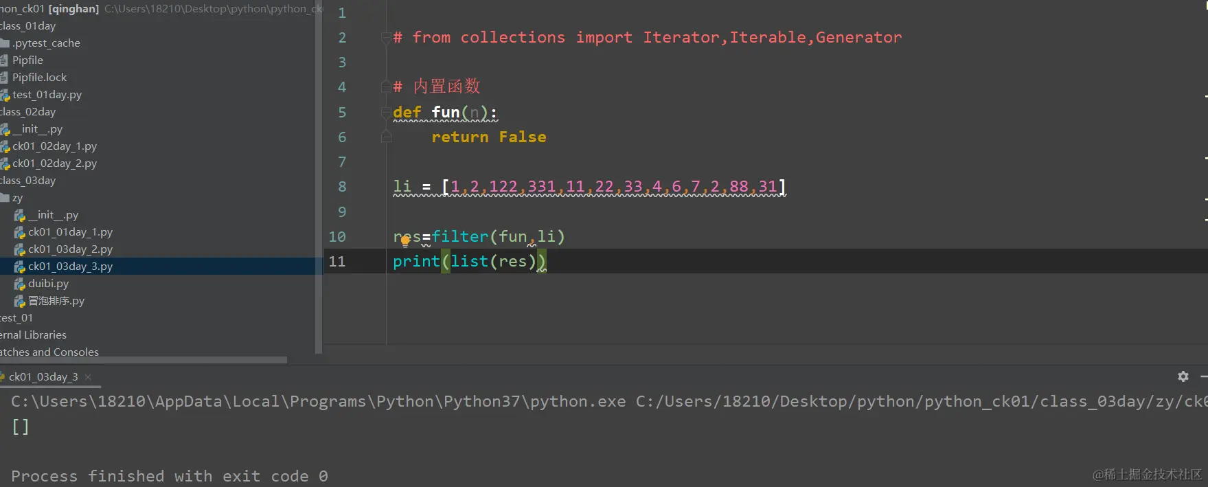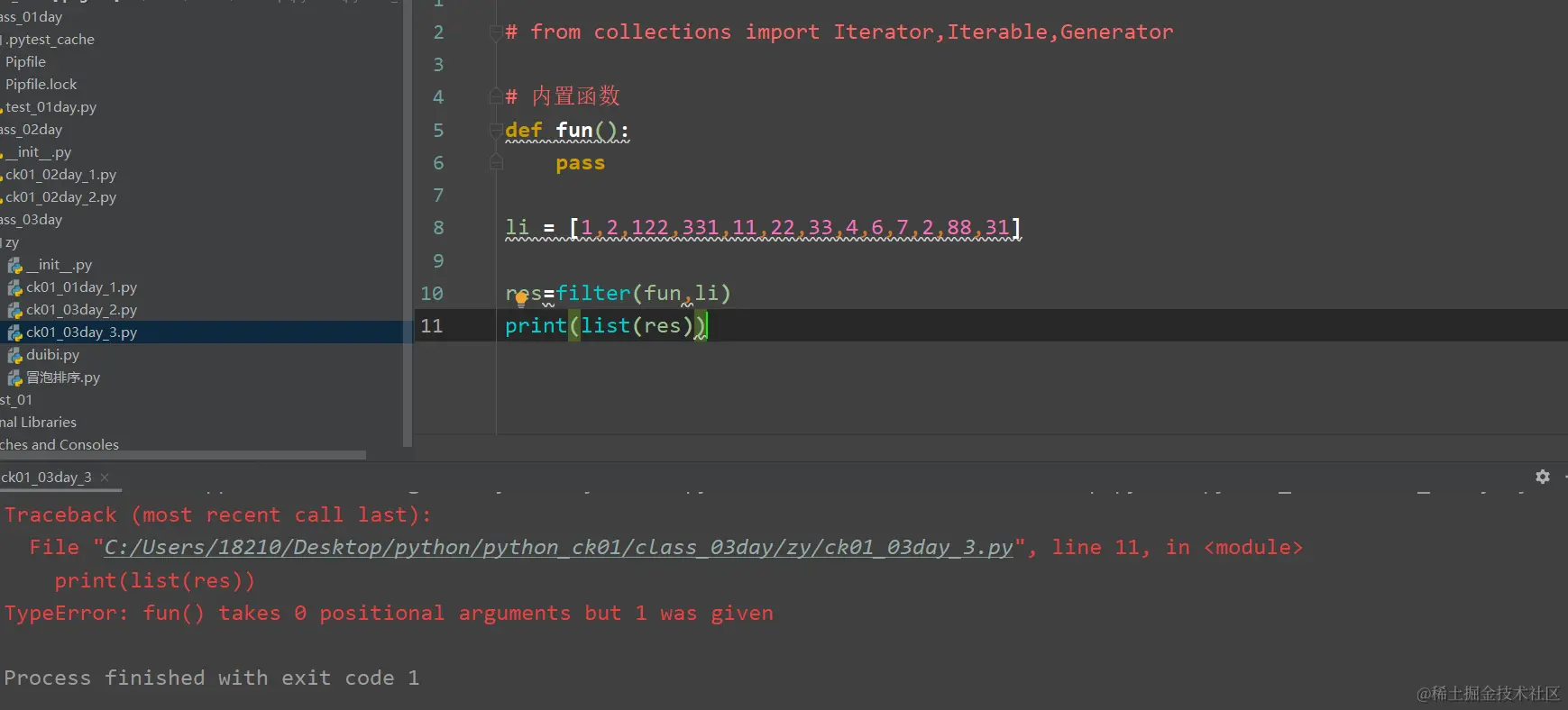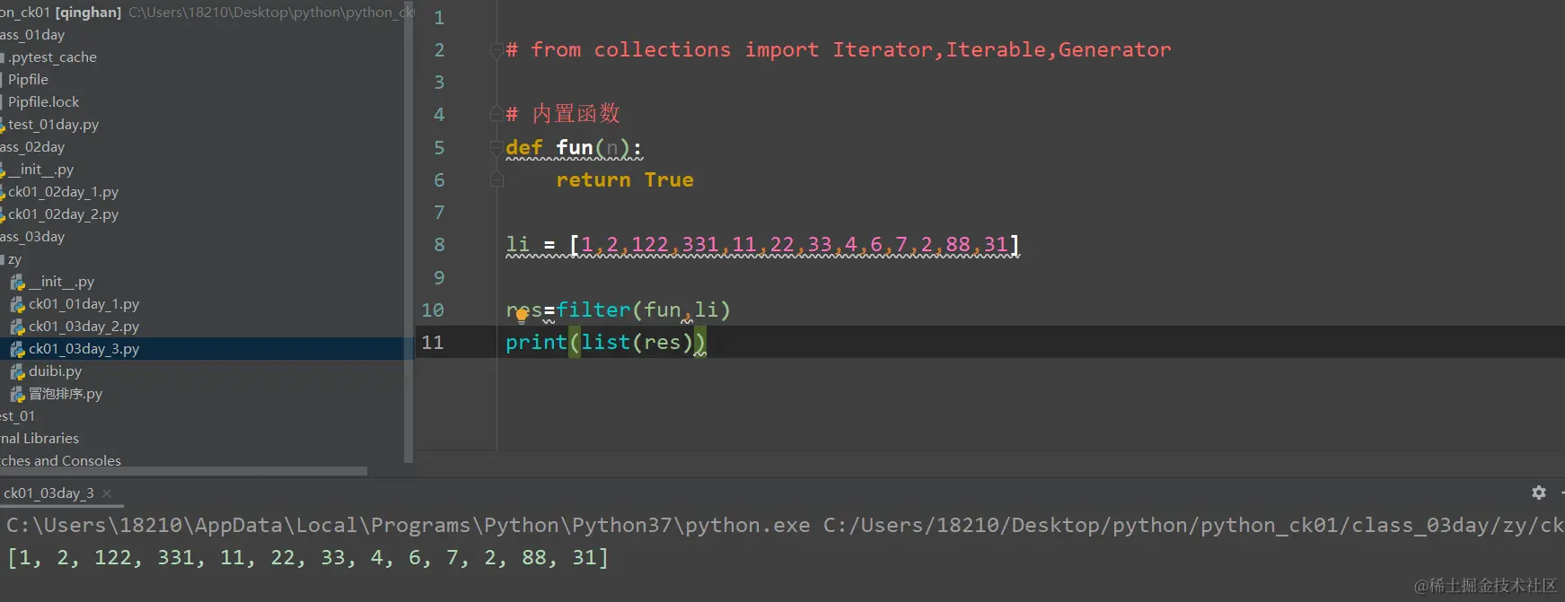 列表是个可迭代对象。filter()这个内置函数传 2 个参数后,会返回出一个对象。
