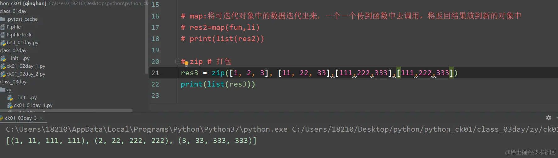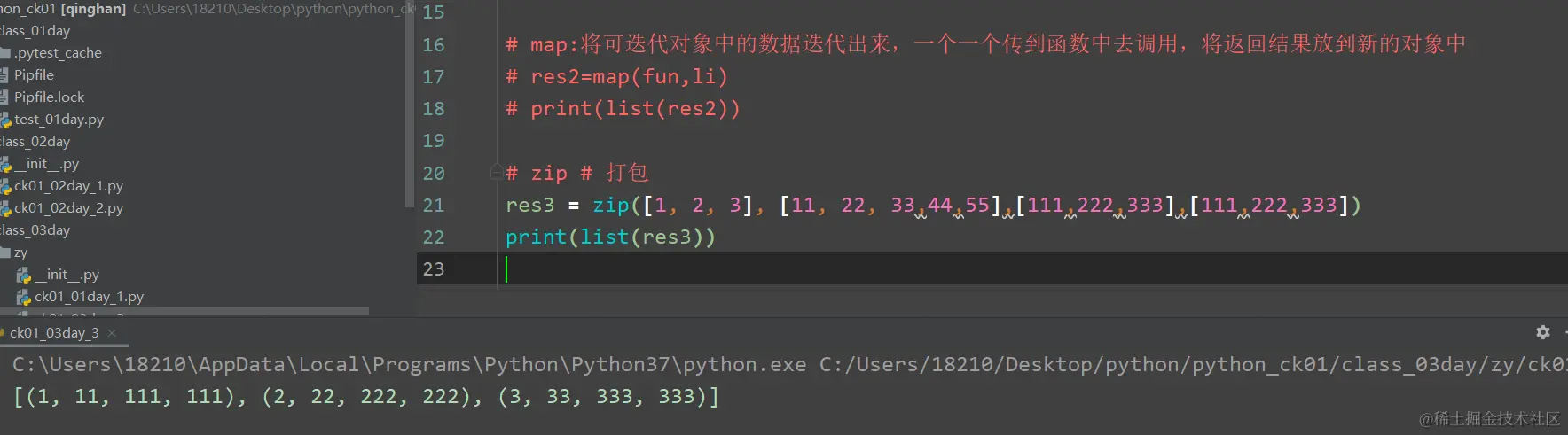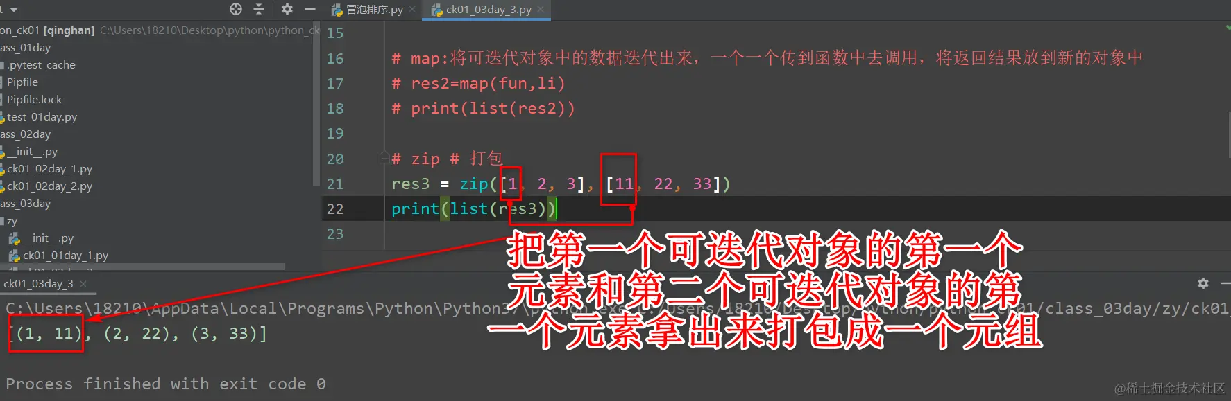 - zip()函数:函数用于将可迭代的对象作为参数,将对象中对应的元素打包成一个个元组。
